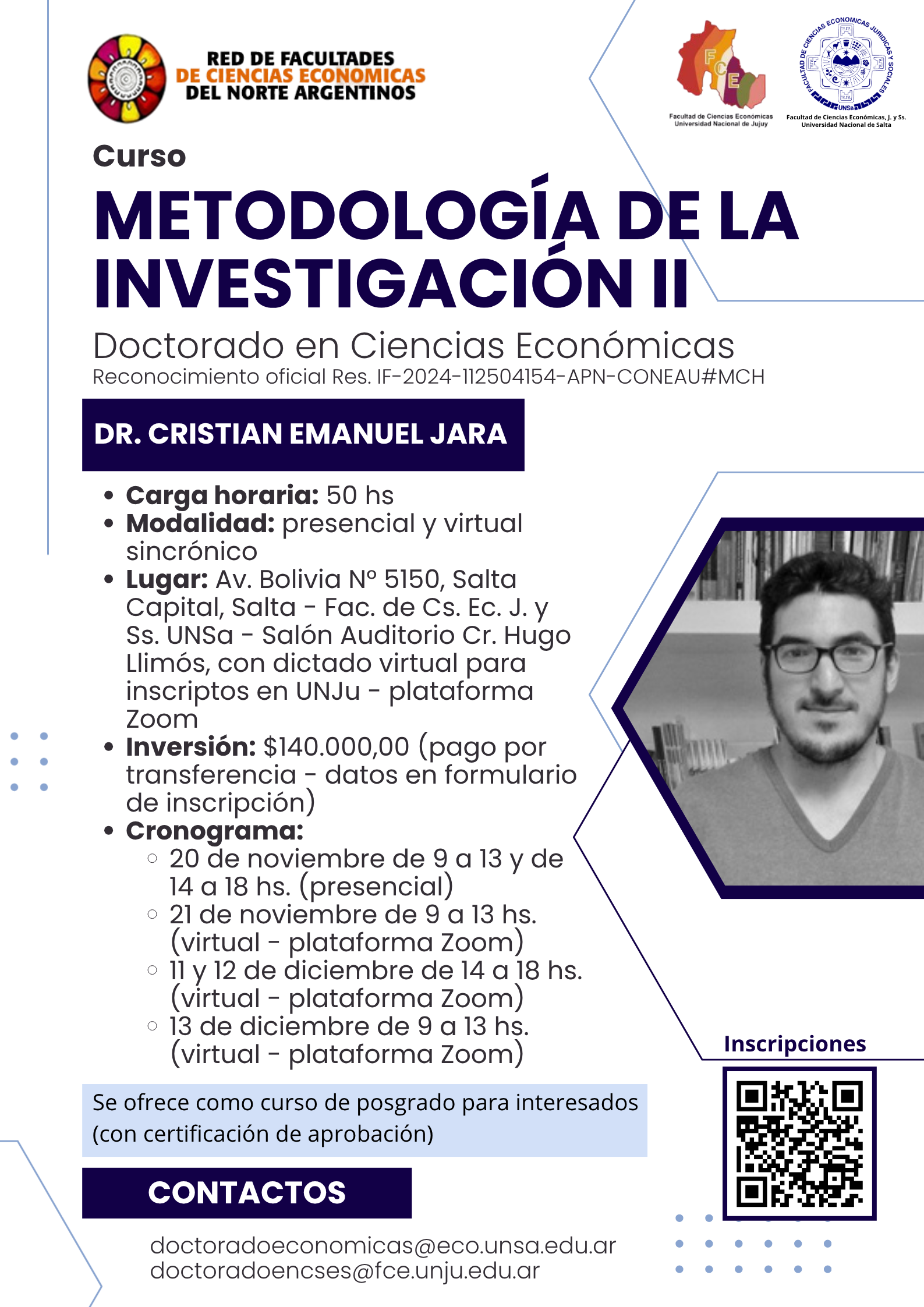 Un (1) cargo regular de Auxiliar Docente de Segunda Categoría, para la asignatura“Estadística I”, de las carreras Contador Público, Plan de Estudios 2019,Licenciatura en Administración y Licenciatura en Economía, Planes de Estudios2022, con extensión de funciones a “Estadística II”, de las carreras Licenciatura enAdministración y Licenciatura en Economía, Planes de Estudios 2022, de SedeSalta y con colaboración al “Servicio de Apoyo Educativo” (SAE). Res. CD-ECO Nº528/25.
