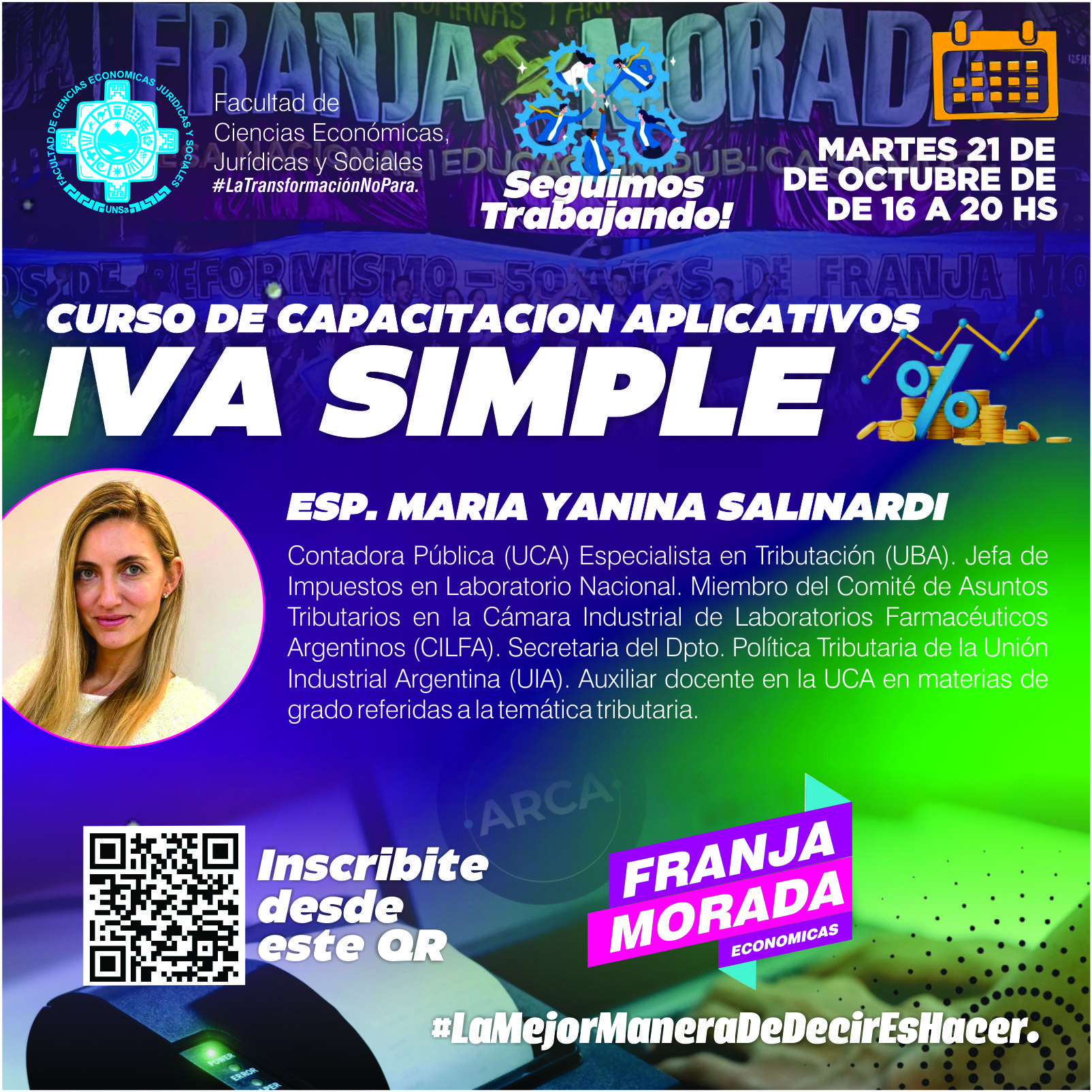 El Martes 21 de Octubre de 16 a 20 llegaremos adelante el Curso de Capacitación sobre Aplicativos IVA SIMPLE. El mismo estará a cargo de María Yanina Salinardi (Contadora Pública (UCA) Especialista en tributacion (UBA). Jefa de Impuestos en Laboratorio Nacional. Miembro del Comité de Asuntos Tributarios en la Cámara Industrial de Laboratorios Farmacéuticos Argentinos (CILFA). Secretaria del Dpto. Política Tributaria de la Unión Industrial Argentina (UIA). Auxiliar docente en la UCA en materias de grado referidas a la temática tributaria).