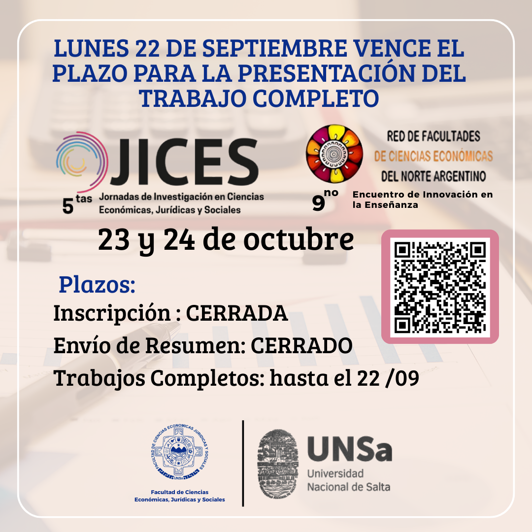 La Secretaría de Investigación y Extensión de la Facultad de Ciencias Económicas, Jurídicas y Sociales de la Universidad Nacional de Salta invita a toda la comunidad universitaria —estudiantes, graduados/as, docentes, personal de apoyo y autoridades— a participar en las 5° Jornadas de Investigación en Ciencias Económicas, Jurídicas y Sociales (JICES) y el 9° Encuentro de Innovación en la Enseñanza de la Red de Facultades de Ciencias Económicas del Norte Argentino.