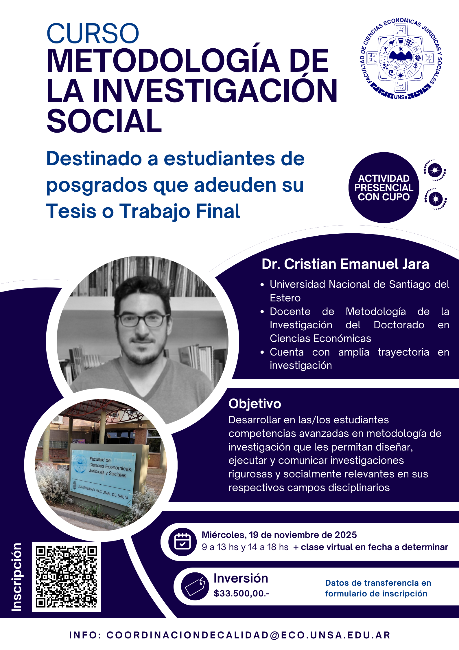 En el marco del Programa de Graduación Efectiva aprobado por Res. CD-ECO N.º 472/25, desde la Coordinación de Aseguramiento de la Calidad de la Facultad de Ciencias Económicas, Jurídicas y Sociales, invitamos a participar del curso-taller “Metodología de la Investigación Social”, a cargo del Dr. Cristian Jara (UNSE–CONICET).